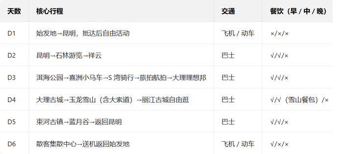 昆明・大理・丽江双飞 6 日纯玩游费用说明