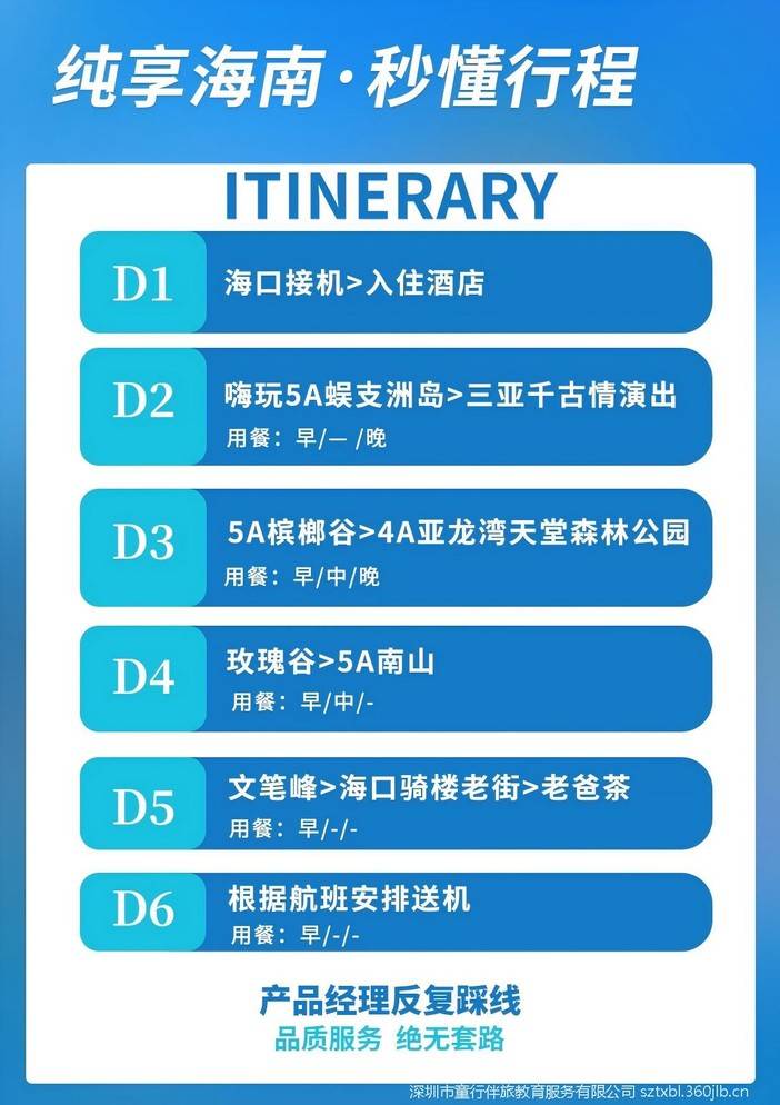 中午12:00时,返程为晚班机的游客可把行李寄存在酒店前台后自由活动或自行开钟点房休息4、行程中含的餐食,早餐为酒店房含餐,不用不退。正餐按产品约定用餐标准操作,不含酒水。海南用餐口味较清淡,建议旅游者提前准备些咸菜或老干妈佐餐