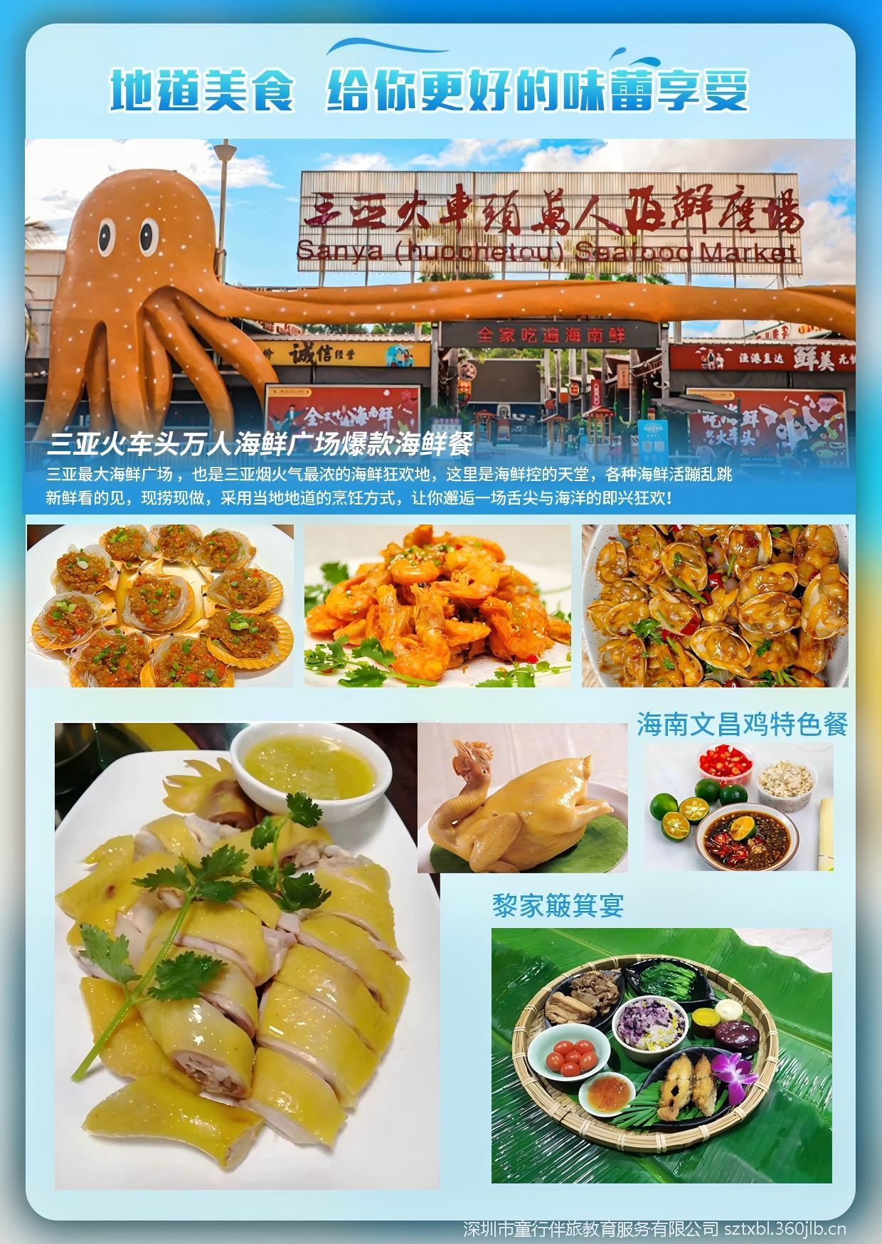 餐: 全程安排4正5早,早餐酒店含(不用不退),餐标30元/人/正; (其中3个特色餐:火车头万人海鲜广场爆款海鲜餐|文昌鸡特色餐|黎家簸箕餐;人数增减时,菜量相应增减,但维持餐标不变)