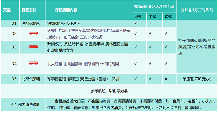 ● 导服:深圳送团导游(不随团)、北京地接导游,不派全陪导游。