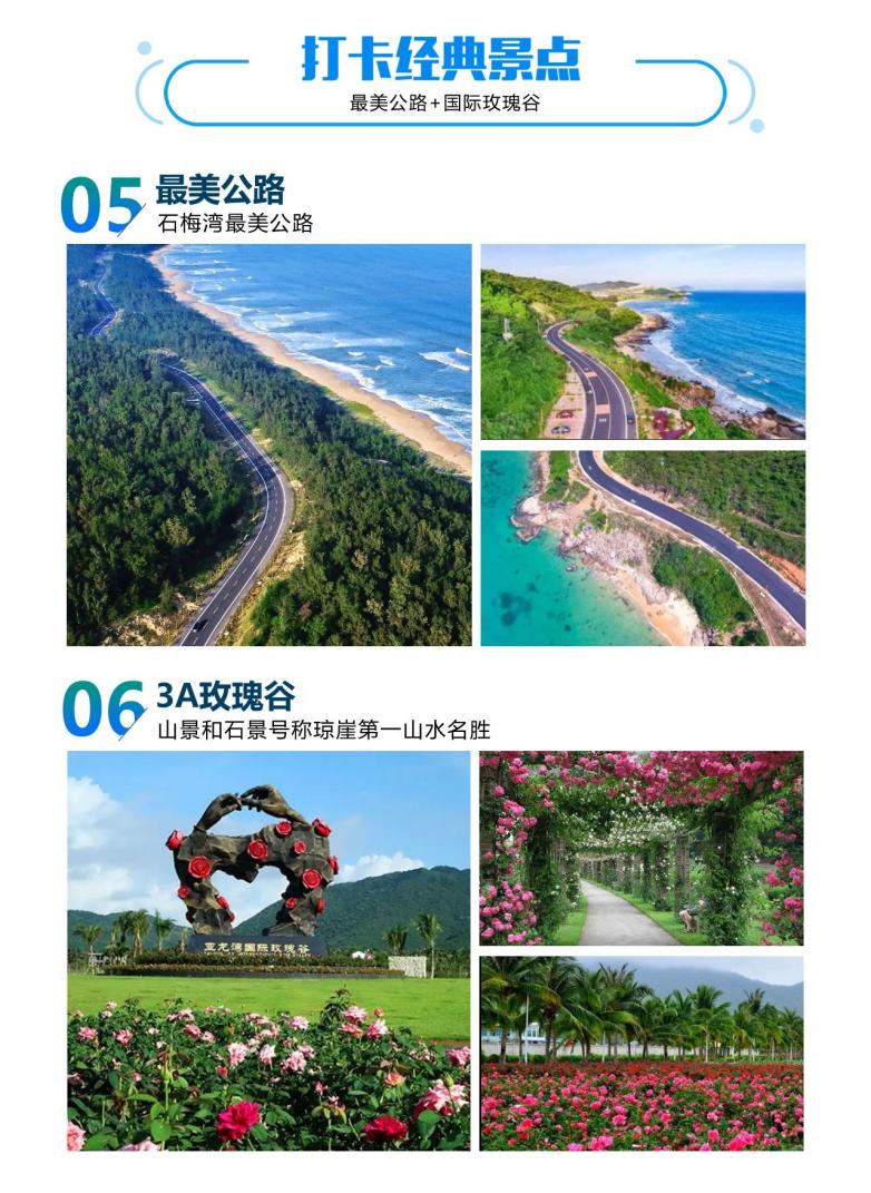 ◆游览◆【亚龙湾玫瑰谷-赠送电瓶车】谷(不少于 90 分钟 )。 ◆(赠送)【亚龙湾沙滩】,游览天下第一湾(不少于 60 分钟)。 ◆前往“每个中国人心中的梦”【天涯海角】4A 级旅游景区 (不少于 90 分钟 )。 ◆【大小洞天】(不少于 90 分钟 ) | |