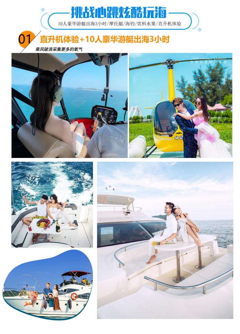 ◆赠送【10 人豪华游艇出海】 出海线路 :游艇码头-远眺鹿头情人山-小青州-凤凰岛-情人湾-远眺第一大道椰梦长廊-三亚角-帆船港附近海域抛锚娱乐-返码回头 VIP 尊享服务项目 1、豪华游艇 3 小时激情出海。 2、海上垂钓(提供鱼竿、鱼饵) 3、激情摩托艇(体验) 4、矿泉水、饮料畅饮 5、 时令新鲜果盘一个。 6、游艇自驾体验。 7、艇上冲淡水 。 8、资深持证船长水手护航。 9、游艇乘客保险 《海上自愿消费》潜水配套自费项目 : 一次性咬嘴或者全面镜( 二选一必选 )海底留念照片或者视频( 自愿选择)。 自愿消费项目 : 一次性咬嘴 =50 元(潜水必买 )进口全面镜 =150 元/次 水下摄影拍照 300/人起 |