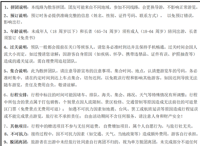 1、拼团说明:本线路为散客拼团,团友可能来自不同地域、参加不同线路,会更换导游,不影响正常游览。 2、预订说明:预订时务必提供准确完整的信息(姓名、性别、证件号码、联系方式), 以免预订错误,影响出行。 3、年龄说明:未成年人(18 周岁以下)和长者(65-74 周岁)须有成人(18-64 周岁)陪同出游,长者须签订《免责书》 4、过关说明:领队一般都会提前在关口等候客人,请您务必准时到达并且保持手机畅通。过关时间会因人流大小而定,如过慢请您谅解;因游客自身原因(如疾病、怀孕、携带违禁品、证件有误、护照抽查等)造成的通关延误,需自理费用追赶团队。 5、集合说明:此为散拼团队,请注意导游宣布的注意事项、集合时间、地点,认清楚游览车的号码,务必准时集中,请在约定时间到达上车点集合,切勿迟到,以免耽误行程和影响其他游客。如因迟到导致无法随车游览,责任及费用自负,敬请谅解。 6、行程安排:行程中标注的时间可能因堵车、排队、海关、集会、路况、天气等特殊情况有所调整;行程中所包含的景点属于打包销售,个别景点因人流限制、景区检修、交通管制等原因造成无法前往的可退景区门票(免费景点无费用可退); 如遇不可抗力因素如地震、台风、罢工或航班延误等原因造成行程延误或不能完成景点游览,旅行社不承担责任; 自由活动期间不含任何服务,请注意人身和财产安全! 7、其他项目:行程中的赠送项目不参与无任何退费。 自费增加项目,属个人自愿行为,与旅行社无关。 8、不可抗力:接待过程中,因不可抗力因素(如交通、天气、当地政策等)造成额外费用,游客自行承担。 9、脱团离团:旅游者在出游中未经旅行社同意自行离团不归的,视为单方脱团离团,未完成部分不退任何 |