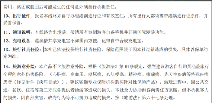 费用,离团或脱团后可能发生的任何意外须自行承担责任。 10、出行证件:报名本线路须自行办理港澳通行证和有效签注,所有出行人都须携带港澳通行证原件,并妥善保管。 11、通讯说明:本线路为出境游,敬请所有参团游客自备手机并开通国际漫游功能。 12、充电设备:港澳借共享充电宝不如国内方便,记得自带合规充电宝。 13、旅行社责任险:本社已依法投保旅行社责任险,保险范围限于因本社过错造成的损失,具体以保单约定为准。 14、旅游意外险:本产品不含旅游意外险,根据《旅游法》第 61条规定,强烈建议游客自行购买涵盖旅行全程的意外伤害保险。(心脏病、高血压、糖尿病、心肌梗塞、精神病、癫痫病、先天性疾病等特殊疾病患者(详见附件《疾病目录》),建议咨询专业保险机构购买针对性保险产品)。游玩过程中,因公共交通、餐饮、住宿等第三方服务提供者给游客造成的损失,本社全力协助游客向责任方索赔,但不承担客人的损失。因自然灾害、政府行为等不可抗力造成的损失,按《旅游法》第六十七条处理。 |
