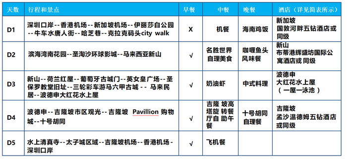 3、签 证 :新加坡、马来西亚目前实施免签政策(香港身份证明书除外) 4、行程门票 :行程表内所列景点入场费 ; 5、酒店住宿 :当地五钻酒店(以两人一房为标准) , 6、用餐标准 :含行程内正餐(具体视航班时间而定) ; 新段餐标¥ 100 元/人/餐 ,马段餐标¥60 元/人/餐 ; 吉隆坡高塔旋转餐厅国际自助午餐¥ 300 元/人/餐 ; 7、旅游保险 :每人累计 45 万旅游意外保险(本旅意险承保人群范围是 2 到 80 周岁 , 低于 2 周岁不予承保 ,高于 70 周岁者只按约定保额赔付一半 ,其中急性病身故保险公司不负责赔偿。)为更好保障您的出行安全,建议您自行购买更高额商业旅游意外险。 |